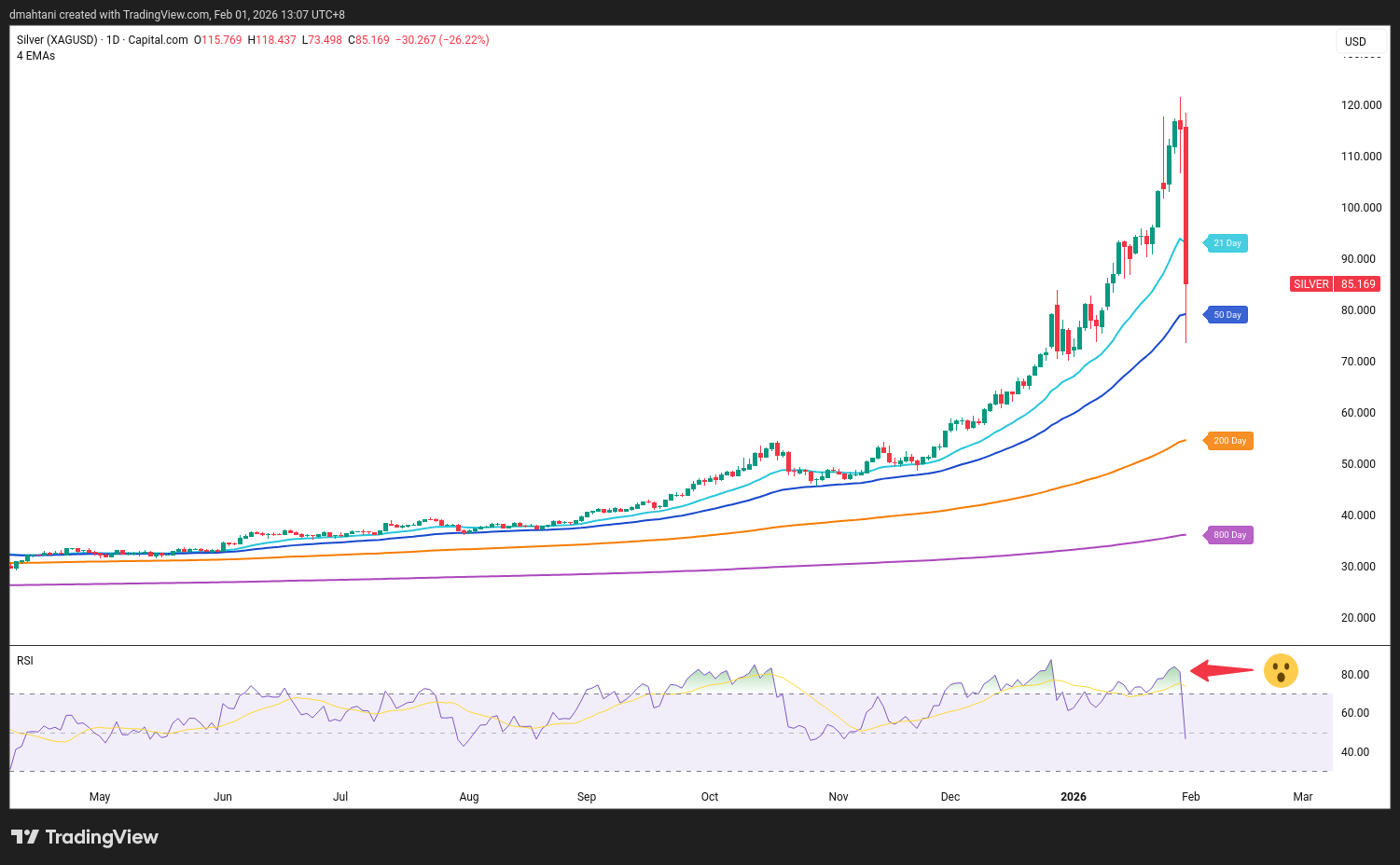 Silver: The 50 EMA is at $79. Same story—this needs to hold. A successful test and bounce off $79 would signal that the panic selling is over and we’re building a base. A break below takes us into much deeper correction territory.
